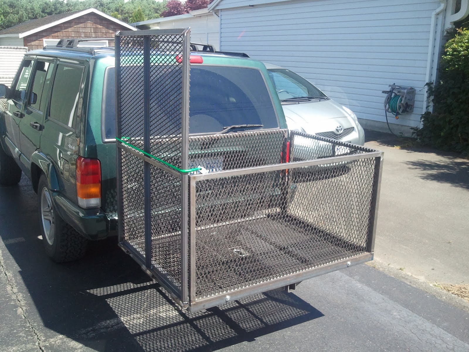 Custom cargo carrier with folding ramp. This carrier mounts to any standard class III hitch and can carry over 300lbs. All the side panels are bolted on allowing you to have the ramp on either side of the carrier. If desired you can even unbolt all the panels and have just a flat cargo tray.